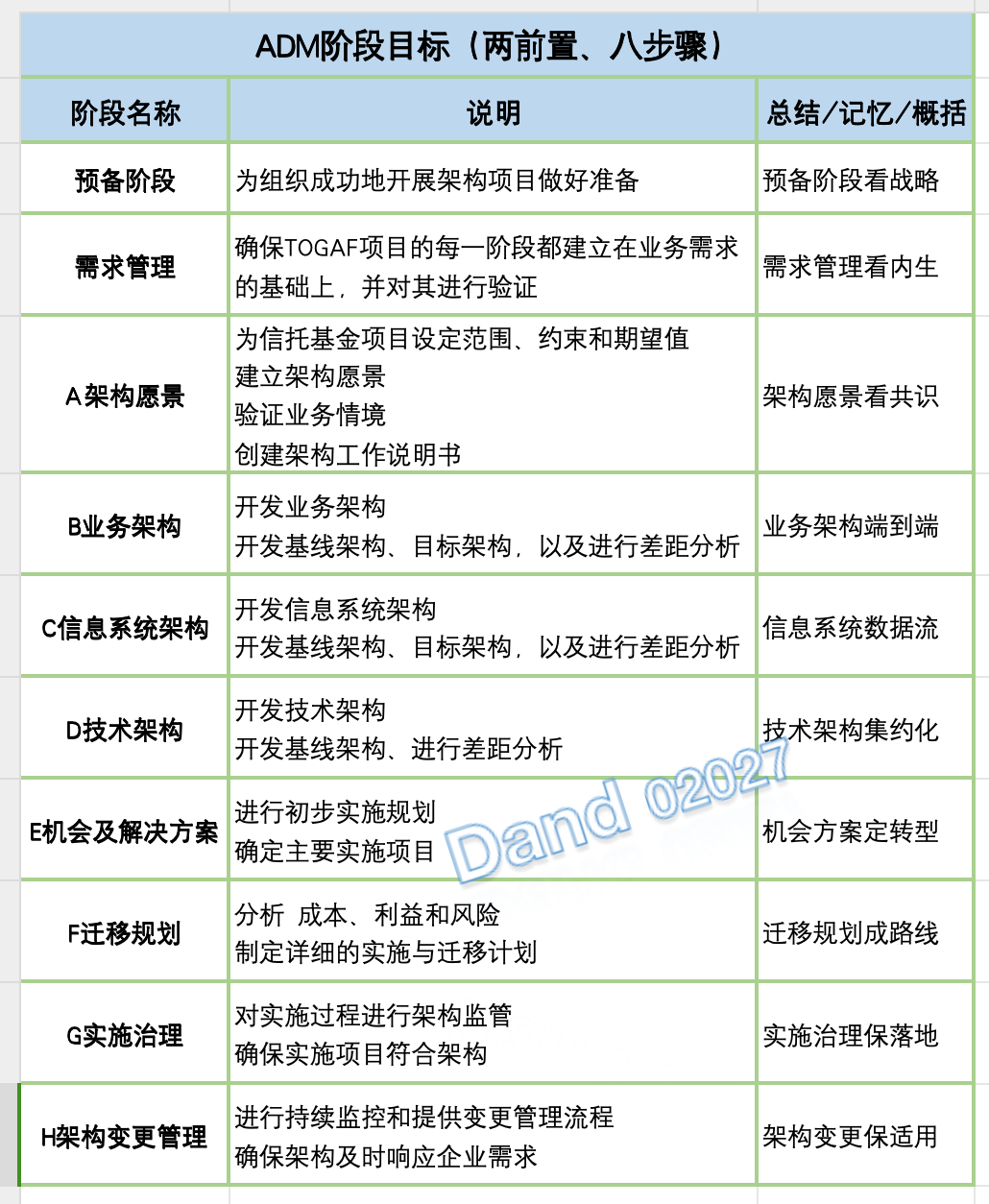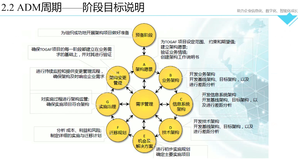 ADM(Architecture Development Method)来自于众多架构师的贡献,它构成了TOGAF的核心。ADM是一种用来获得特定组织企业架构的方法,特别为应对业务需求而设计。