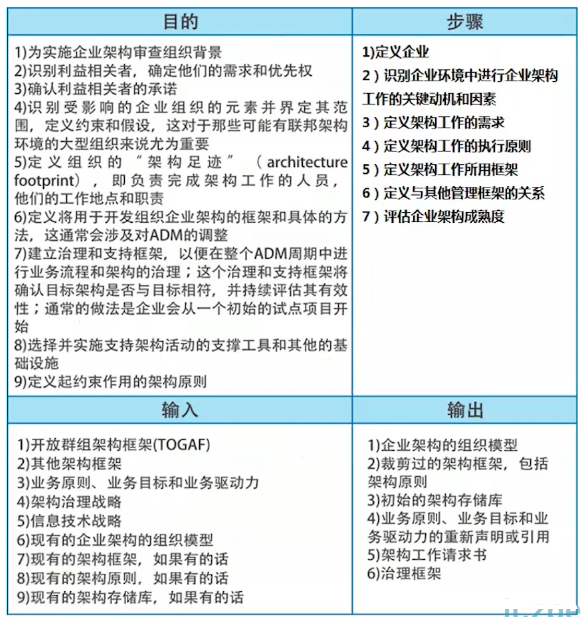 本阶段包括准备和启动创建架构能力所需的各项活动,如: