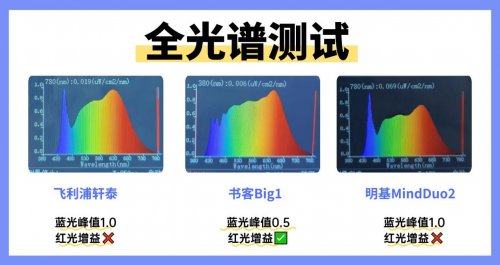 书客Big1表现最优,其新一代SunArc三芯片全光谱灯珠从发光端重构SPD,精准压制415-455nm有害蓝光,实测蓝光峰值仅0.5,远低于RG0安全阈值,还通过RRT3.0红光技术补充有益红光,光谱曲线连续平滑,接近自然日光,从根源减少眼睛疲劳;明基MindDuo2和飞利浦轩泰光谱表现一般,蓝光峰值在1.0附近,接近安全临界值,并且没有红光增益设计,长期使用会加重眼部负担,增加眼睛疲劳风险。