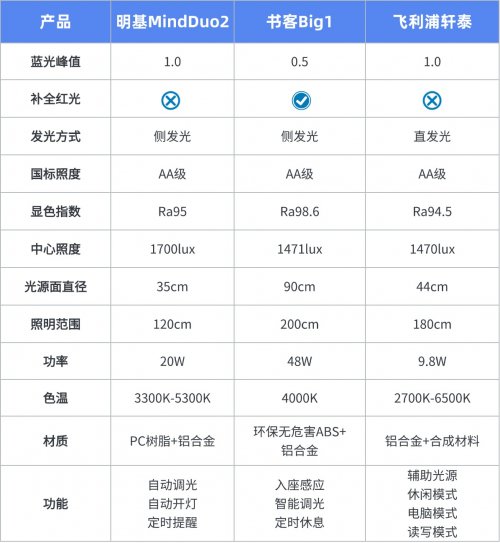 为了让大家直观看清三款产品在蓝光控制、显色指数、中心照度等核心维度的差异,我们整理了关键参数表格(如下)。通过这些数据,能快速定位每款产品的优势与短板,为选购提供清晰参考。
