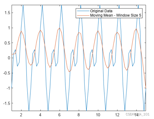 移动均值方法可获得数据的大致形状,但不能非常准确地捕获波谷(局部最小值)。由于波谷点在每个窗口中两个较大的邻点之间,因此均值不是那些点的理想近似值。如果使窗口大小变大,均值将完全消除较短的波峰。对于这种类型的数据,您可能需要考虑其他平滑技术。