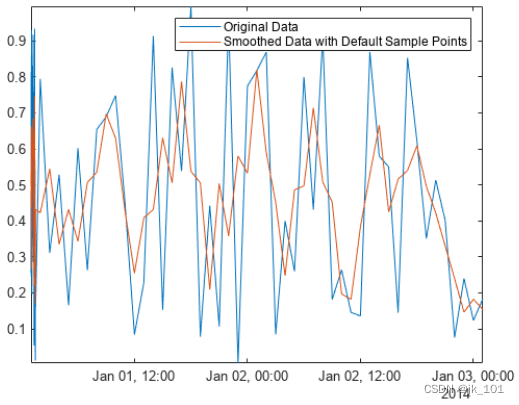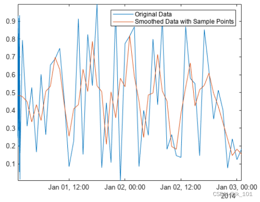 默认情况下,smoothdata 按照等间距整数进行平滑处理,在本例中为 1,2,...,78。由于整数时间戳与 Airreg 中各点的采样不协调,前半小时的数据在平滑后仍然出现噪声。