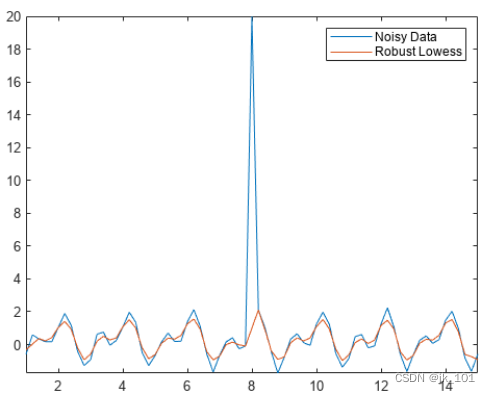 稳健的 Lowess 方法是另一种平滑方法,尤其适用于含噪数据还包含离群值的情形。在含噪数据中插入离群值,并使用稳健的 Lowess 方法对数据进行平滑处理,从而消除离群值。