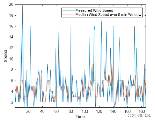 同样,可以使用 movmedian 函数计算滑动窗中的风速中位数。