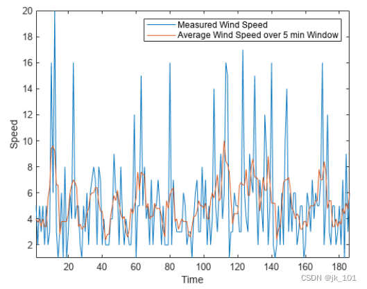 例如,假设每分钟测量一次风速,持续约 3 小时。使用 movmean 函数和 5 分钟的窗口大小可去除高速阵风。