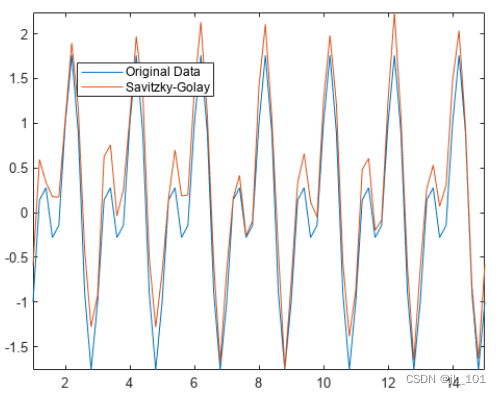 smoothdata 函数提供几种平滑选项,如 Savitzky-Golay 方法,这是一种常用的信号处理平滑技术。默认情况下,smoothdata 根据数据为方法选择最佳估计窗口大小。