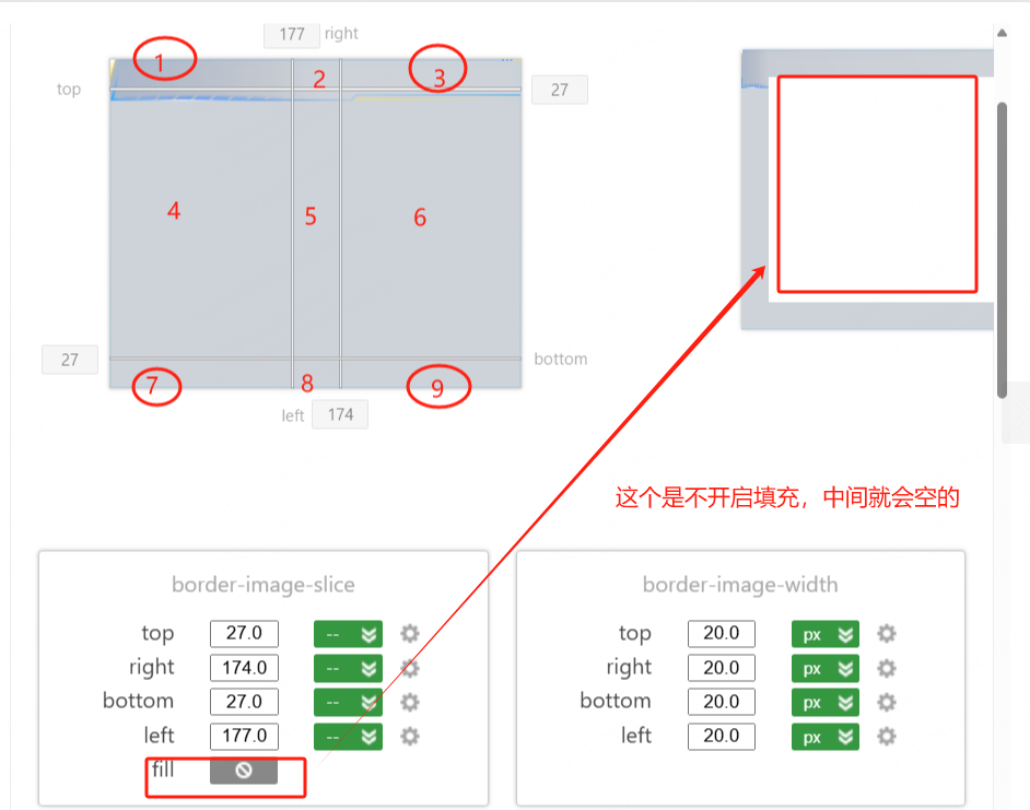 border-image-slice: 27 174 27 177 fill; // fill 填充中间元素,使中间区域不会留白