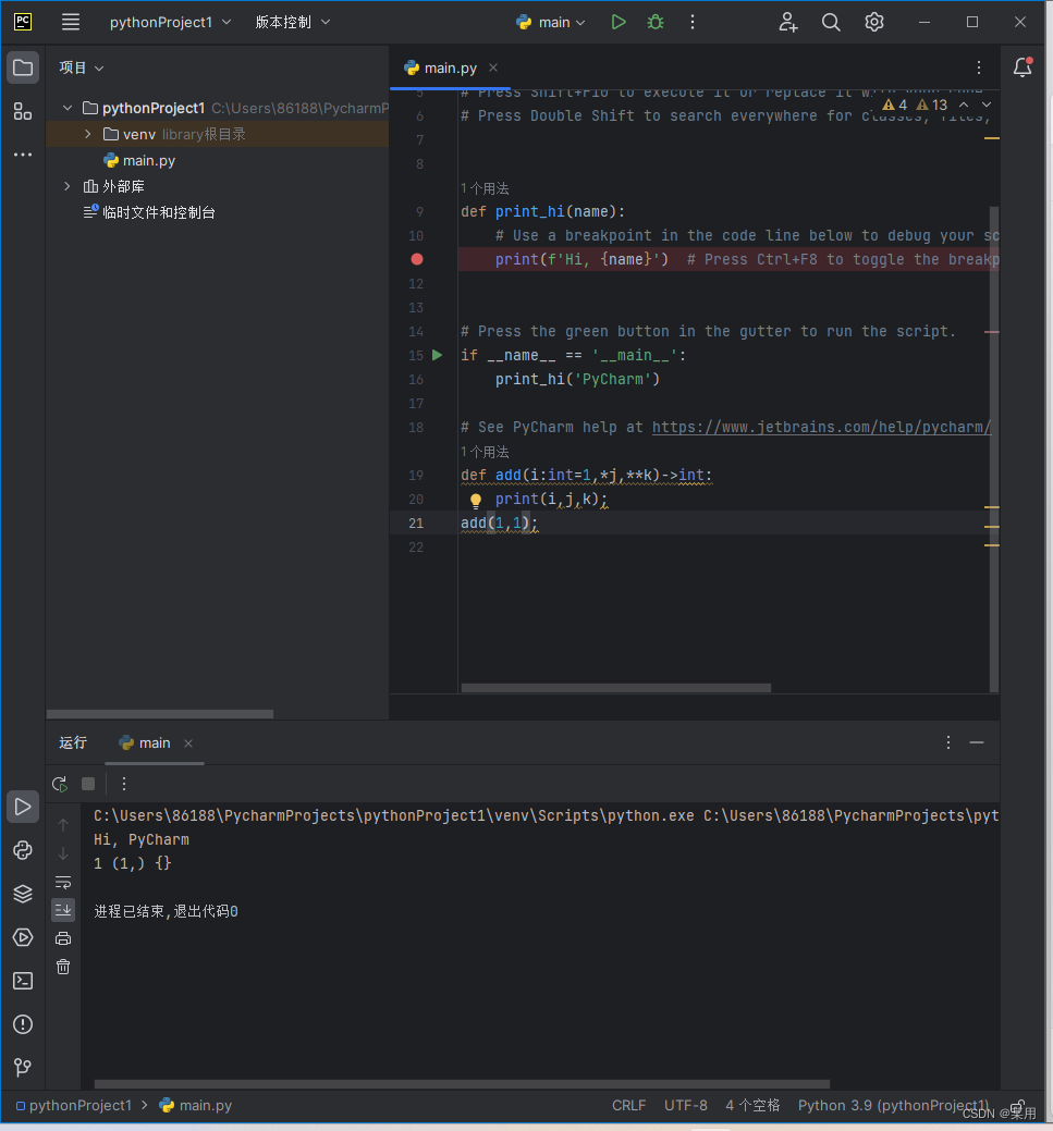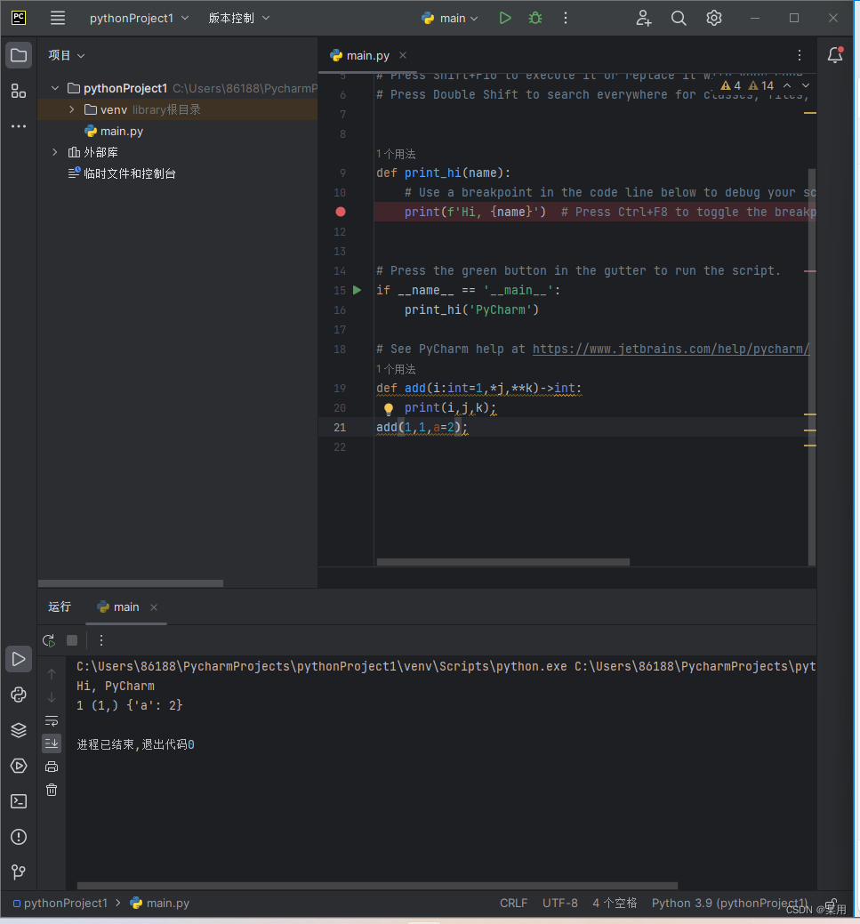 如图我们可以知道其中第一个位置参数1被解析成了形参i的值,而第二个位置参数1则被解析成可变位置参数*j中的一个元素。那么我们怎么才能让k表示出来呢?是不是再在后面加上一个数呢?