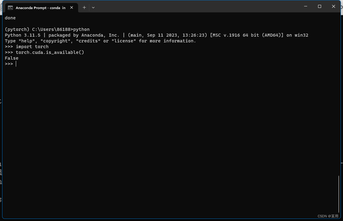 下载完以后为了验证自己是否成功可以跟我一样输入python然后再输入import torch之后再输入torch.cuda.is_available