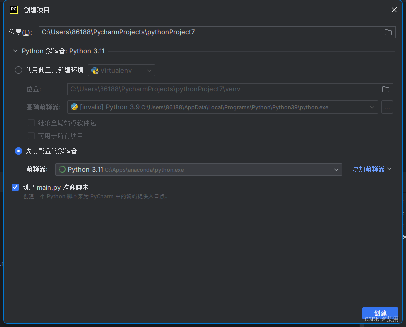 在新项目这边点击添加解释器,然后在这里点击anaconda