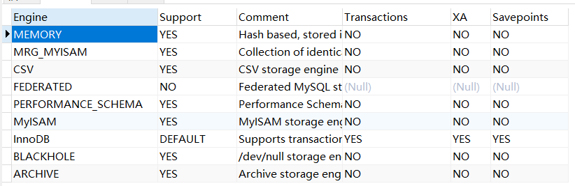 Support列表示某种引擎是否能使用:YER表示能使用,NO表示不能使用,DEFAULT表示为当前默认存储引擎。