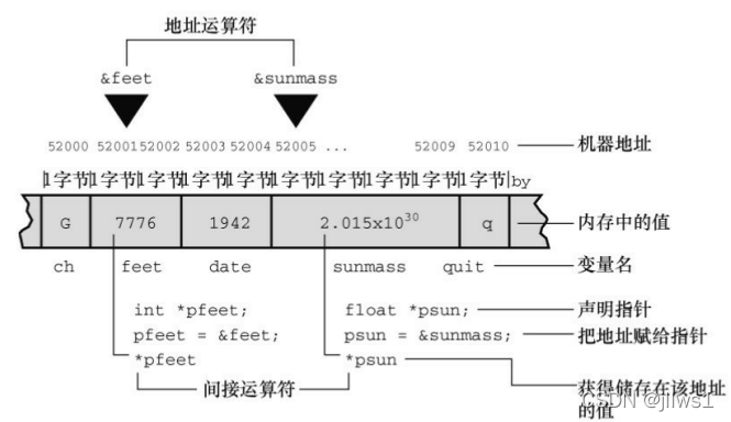 在许多语言中,地址都归计算机管,对程序员隐藏。然而在 C 中,可以通过&运算符访问地址,通过*运算符获得地址上的值。例如,&barn表示 变量barn的地址,使用函数名即可获得变量的数值。例如,printf("%d\n", barn)打印barn的值,使用*运算符即可获得储存在地址上的值。如果pbarn= &barn;,那么*pbarn表示的是储存在&barn地址上的值。