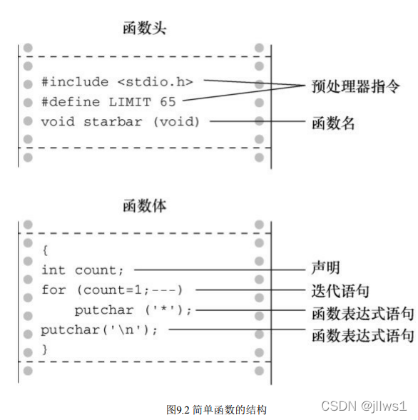 程序中strarbar()和main()的定义形式相同。首先函数头包括函数类型、 函数名和圆括号,接着是左花括号、变量声明、函数表达式语句,最后以右花括号结束(见图9.2)。注意,函数头中的starbar()后面没有分号,告诉编译器这是定义starbar(),而不是调用函数或声明函数原型。