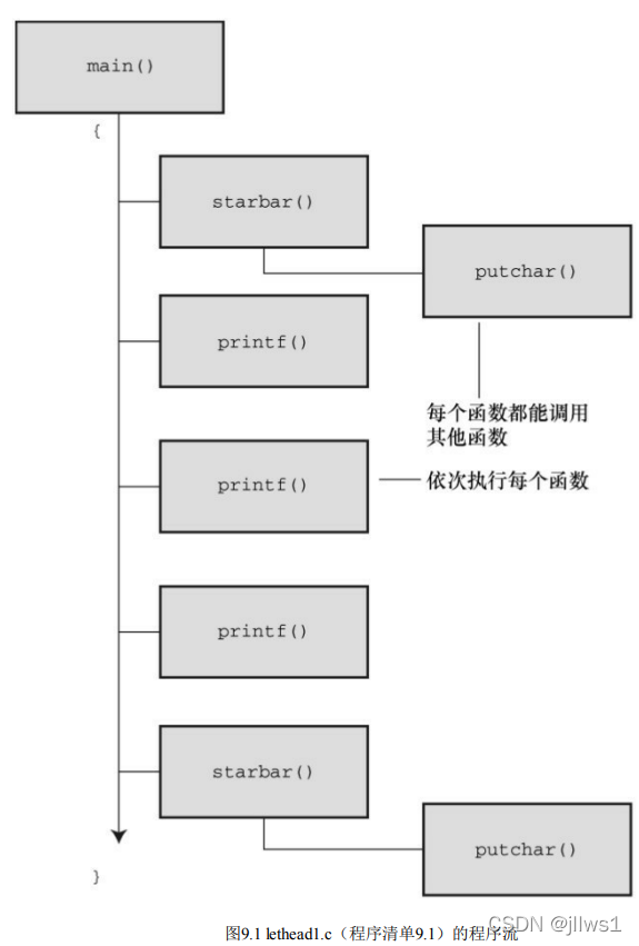 当计算机执行到starbar();语句时, 会找到该函数的定义并执行其中的内容。执行完starbar()中的代码后,计算机返回主调函数(calling function)继续执行下一行(本例中,主调函数是 main()),见图9.1(更确切地说,编译器把C程序翻译成执行以上操作的机器语言代码)。