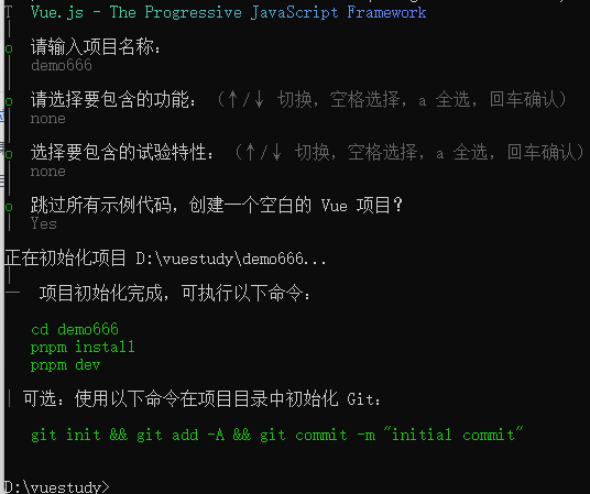 在这里,我们什么都不选择,建立一个最基本的vue项目就可以,项目名称为demo666,后期我们会在这个项目的基础上进行各项功能的增加。