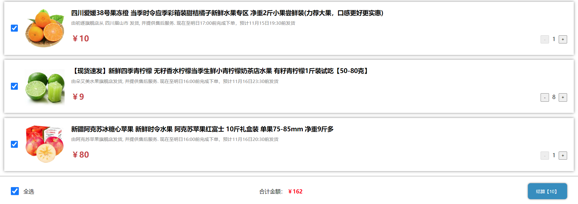subtitle: '由朵艾美水果旗舰店发货, 并提供售后服务. 现在至明日16:00前完成下单,预计11月16日23:30前发货',