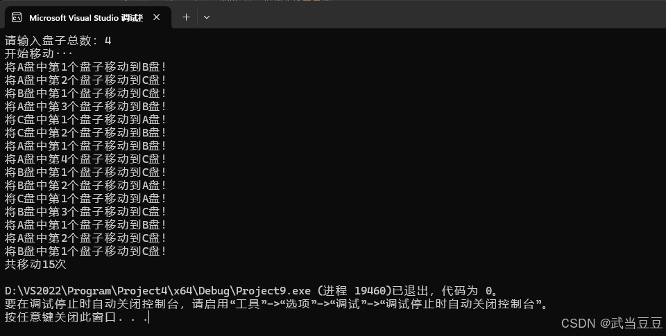 注意:即使每秒移动一百万次,将64个盘子移动完成,需要2的64次方减一次,也需要近六千年才能完成,不建议使用较大的数尝试。