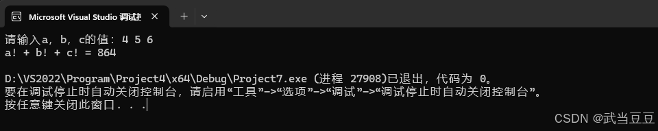 cout << "a! + " << "b! + " << "c! = " << sum << endl;