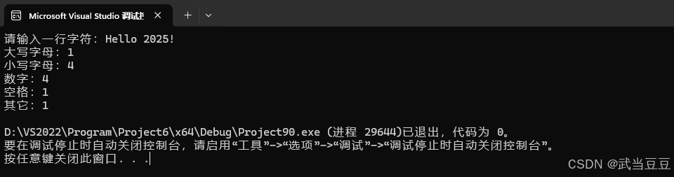 例5:输入一行文字,找出其中的大写字母、小写字母、空格、数字以及其它字符各有多少。