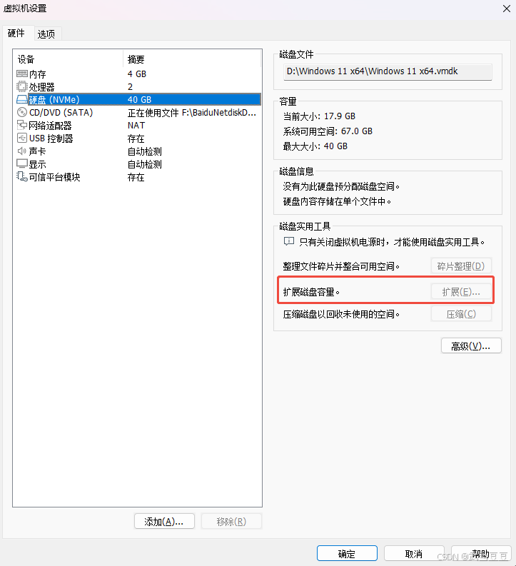 想要扩展虚拟机磁盘容量,需要删除所有快照,然后在设置中扩展。