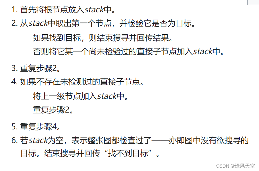 简单来说,就是沿着起始节点一直向节点的子节点,子节点的子节点……一直向最深处(叶子节点)搜索,若搜索到最深处(下一个节点为空),还未找到目标,则返回上一级节点,寻找该节点的另一个子节点,再继续这个过程。