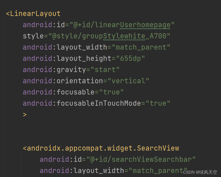 这时候我意识到了该java代码是没有用的,得去改xml,于是在SearchView的上级控件中增加了这两个属性: