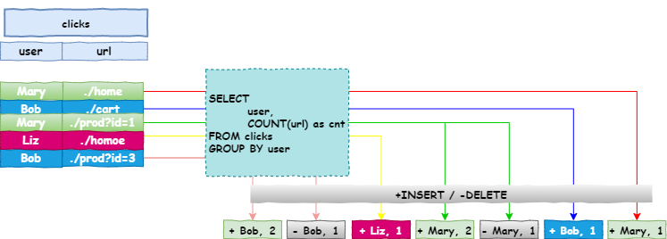 INSERT,UPDATE和DELETEDML操作语句的结果,通常被称为changelog stream(更新日志流)。 - 一个物化视图由一个查询语句进行定义。为了更新雾化视图,查询会连续处理雾化视图的变更日志流。
