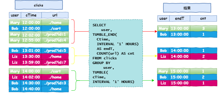 上面演示的是一个分组聚合的案例,下面再来看一个窗口聚合的案例。按照一个小时的滚动窗口(Tumble Window)计算该一小时内的用户点击情况,具体如下图所示:
