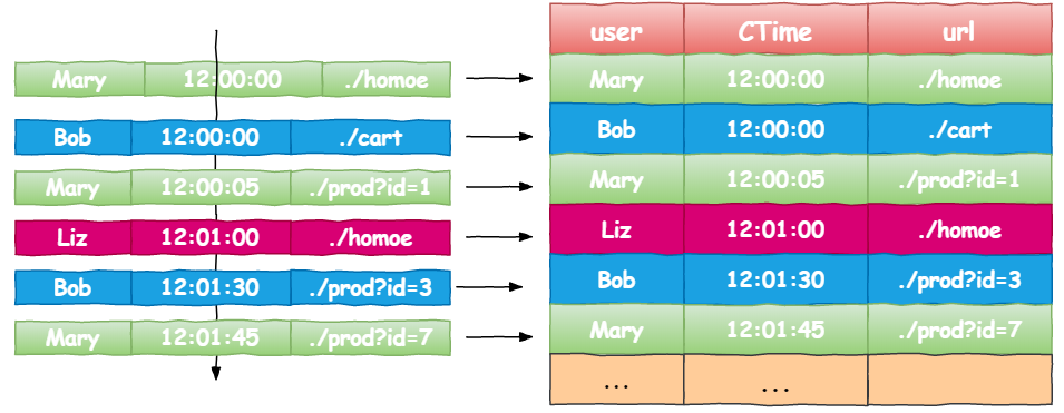 如上图所示:Ctime表示事件发生的时间,可以看出在[12:00:00,12:59:59]的一小时内总共有四行数据,在[13:00:00,13:59:59]的一小时内有三行数据,在[14:00:00,14:59:59]一小时内总共有四行数据。