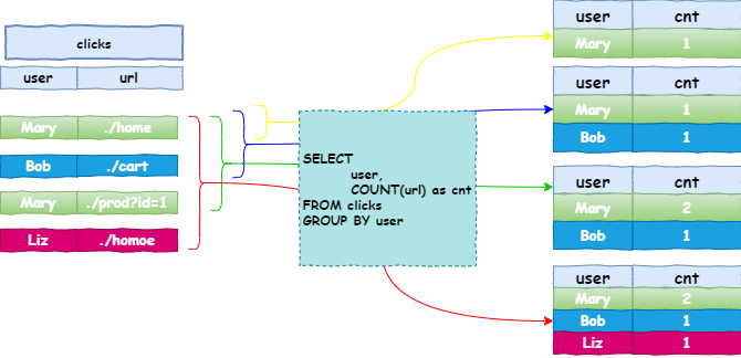 上图中展示了一个用户点击行为的数据,计算操作使用的是分组聚合(group aggregation)。当第一条数据[Mary,./home]进来时,会立即进行计算操作,并输出计算结果:[Mary,1]。当[Bob,./cart]进来时,也会立即进行计算,并输出计算结果:[Mary,1],[Bob,1]。当[Mary,./prod?id=1]进来时,会立即进行计算,并输出结果:[Mary,2],[Bob,1]。由此可以看出:分组聚合会作用在所有的数据上,并且会更新之前输出的结果。