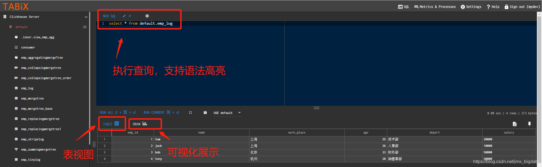在这里,使用默认的用户名:default,密码不用填写,登录的url即是要访问的ClickHouse Server的地址,默认端口号为8123。登录之后,界面如下: