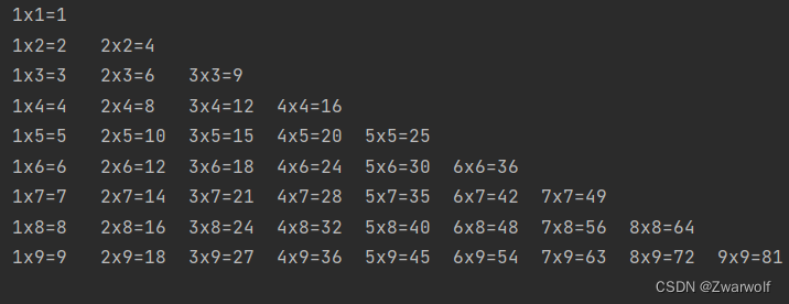 System.out.print(j + "x" + i + "=" + i*j + "\t");