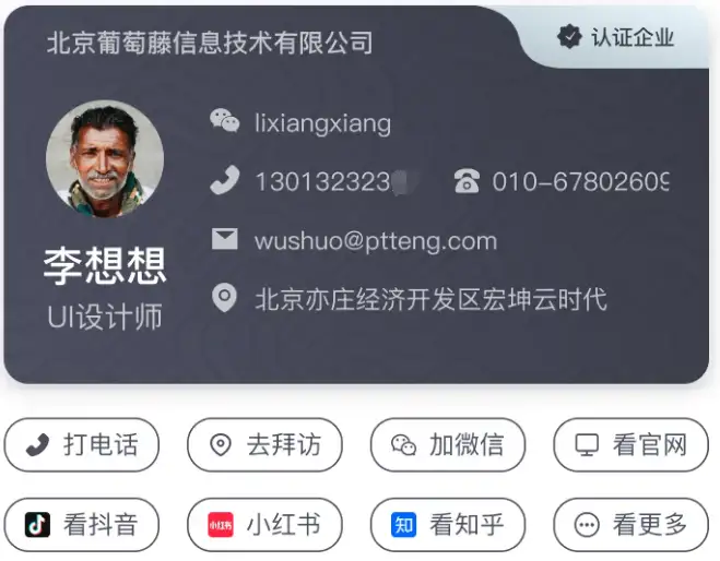 数字名片:在纸质名片的基础上,增加了微信、电话、邮箱等联系方式,还可以通过二维码直接添加微信或访问官网。
