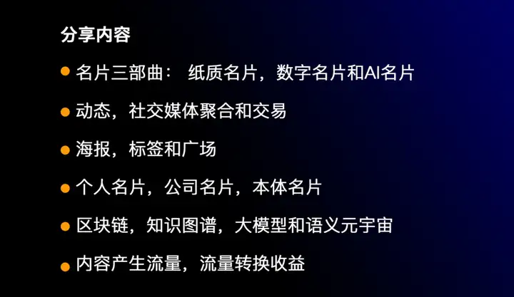 本次主要分享数字名片的创新功能和未来发展方向,邀请创业者和项目老板分享自己的项目,促进交流与合作。