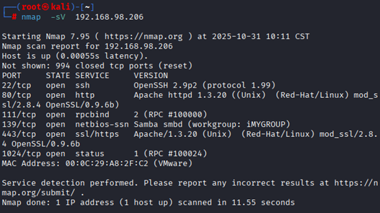 139/tcp → Samba 3.x 一系列端口,我们初步判定该机是我们的靶机;