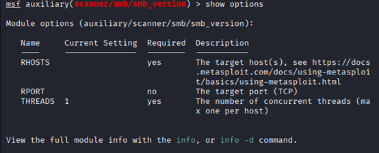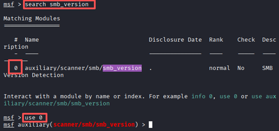 search smb_version #搜索smb识别板块 use 0 #使用 show info #显示详细的相关参数 set rhosts 192.168.98.206 #设置目标主机 exploit #实施