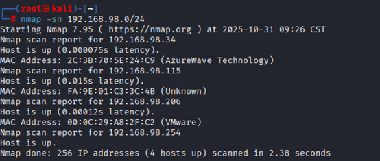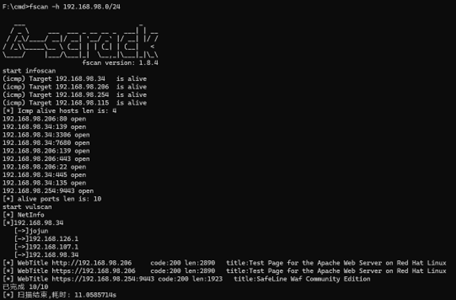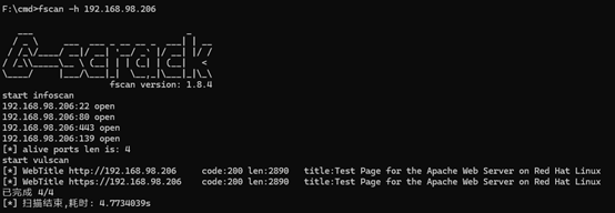 结合上述各个图可以看出该网段有4台存活主机,通过fscan的结果可以看出其中192.168.98.206这台机开放了