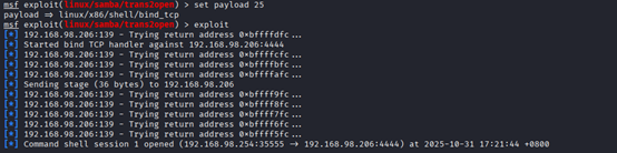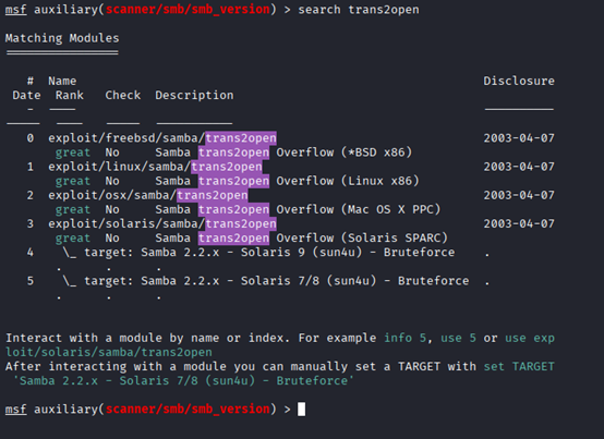 我们通过msfconsole来进行 寻找Samba版本漏洞-寻找攻击程序-实施攻击一系列措施