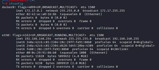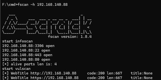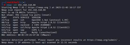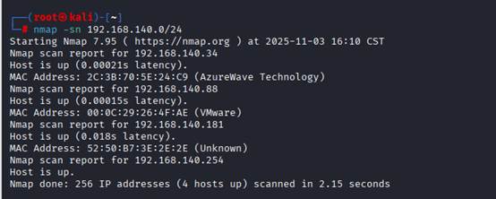 综上图所示可以看出该网段有4个主机,通过图片可以判断出IP地址为192.168.140.88应该是我们所需要找的靶机
