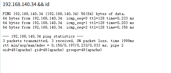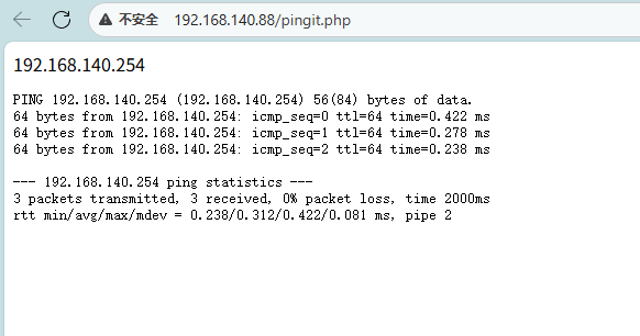 发现能成功ping通,我们可以思考,如果这个网页有命令执行功能,没有上传功能,我们往往可以考虑一下这类功能会存在命令注入漏洞我们可以尝试使用 ; && 等类似的分隔符进行注入