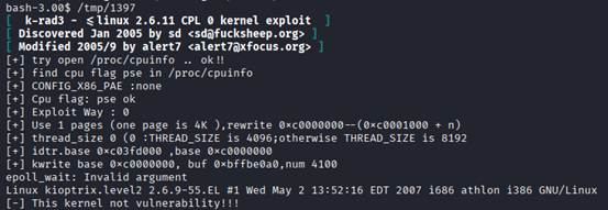 发现内核版本是2.6.9-55.EL,这是个经典的老版本,有已知的本地提权漏洞,所以我们可以去寻找一下有没有常用的exploit