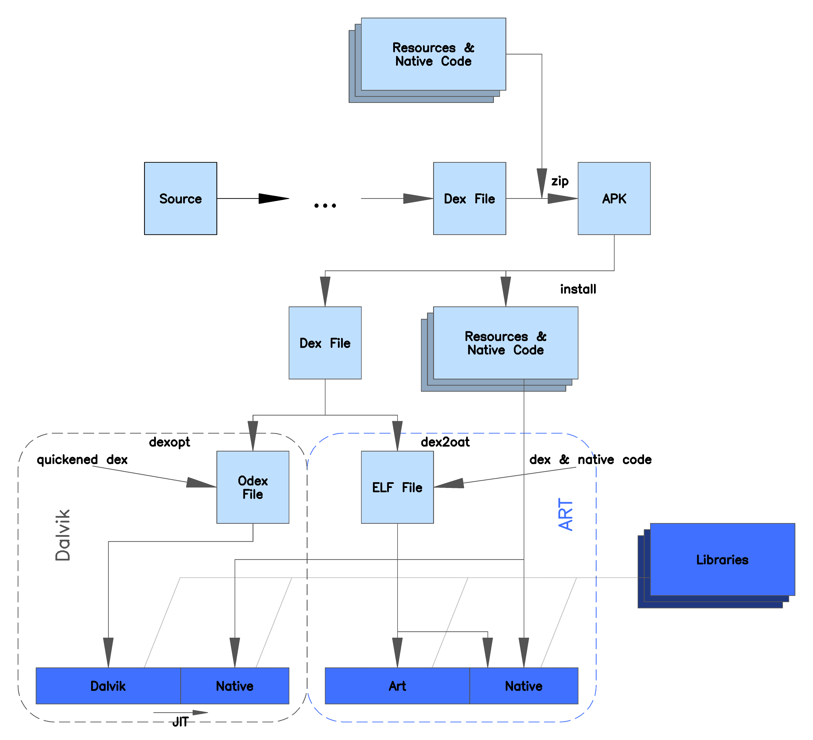 AOT编译是在应用程序安装时就进行的工作,下图描述了Dalvik虚拟机与(Android 5.0上的)ART虚拟机在安装APK时的区别: