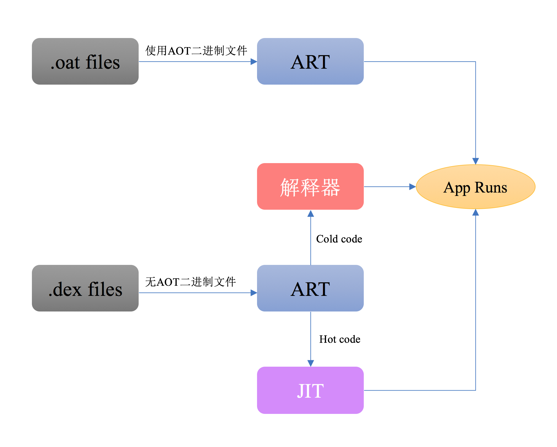 - 最初在安装应用程序的时候不执行任何AOT编译。应用程序运行的前几次都将使用解释模式,并且经常执行的方法将被JIT编译。