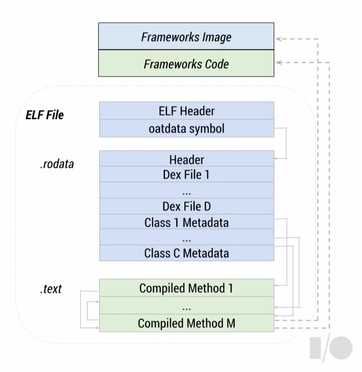 - 如果有 .oat 文件(即 .dex 文件的 AOT 二进制文件),则 ART 会直接使用该文件。虽然 .oat 文件会定期生成,但文件中不一定会包含经过编译的代码(即 AOT 二进制文件)。