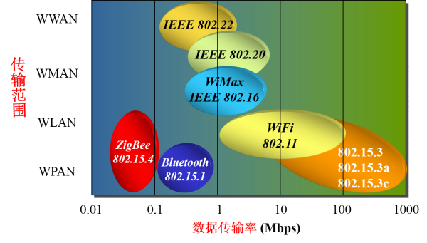 3)ZigBee与2.4G的联系,首先ZigBee是属于2.4G其中的一种技术,而同处于2.4G的还有其他无线技术,比如Wi-Fi、蓝牙等(见下图)。并且ZigBee技术并未都是2.4G,它在欧洲的标准是868MHZ、北美是915MHZ。