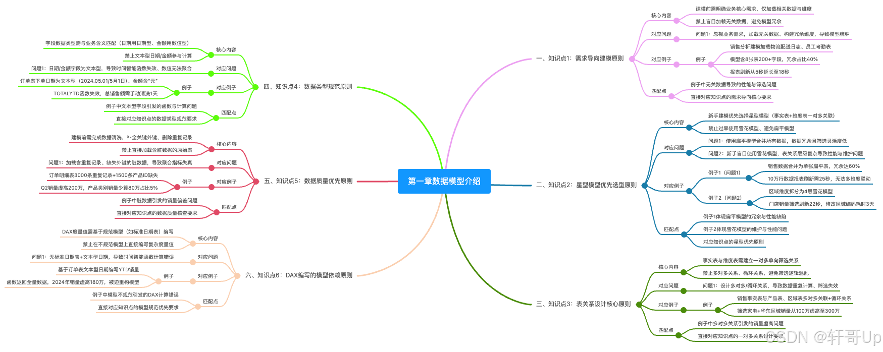 本章核心目标是:搭建数据建模的基础认知框架,明确 PowerBI 数据建模的定义、核心价值与核心作用,掌握数据模型的基本构成要素、核心类型及通用建模流程,解决 “为何需要数据建模”“数据模型由什么组成”“建模该遵循什么步骤” 等入门疑问,为后续章节的进阶建模(事实表 / 维度表设计、关系构建、DAX 计算)奠定认知基础。