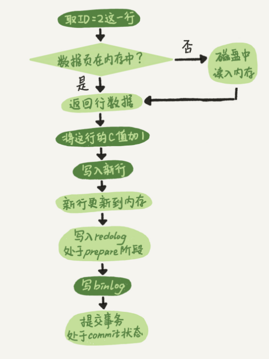 - 执行器先找引擎取ID=2这一行。ID是主键,引擎直接用树搜索找到这一行。如果ID=2这一行所在的数据页本来就在内存中,就直接返回给执行器;否则,需要先从磁盘读入内存,然后再返回。