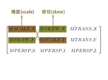 从上图可以看到最后三个参数是控制透视的,这三个参数主要在3D效果中运用,通常为(0, 0, 1),不在本篇讨论范围内,暂不过多叙述,会在之后对文章中详述其作用。