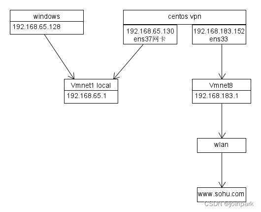 centos的有两个网卡,一个是192.168.65.130,一个是192.168.183.152。其中192.168.65.0/24是一个内网子网。 192.168.183.0/24是vmnet8的子网,可以连接外网。