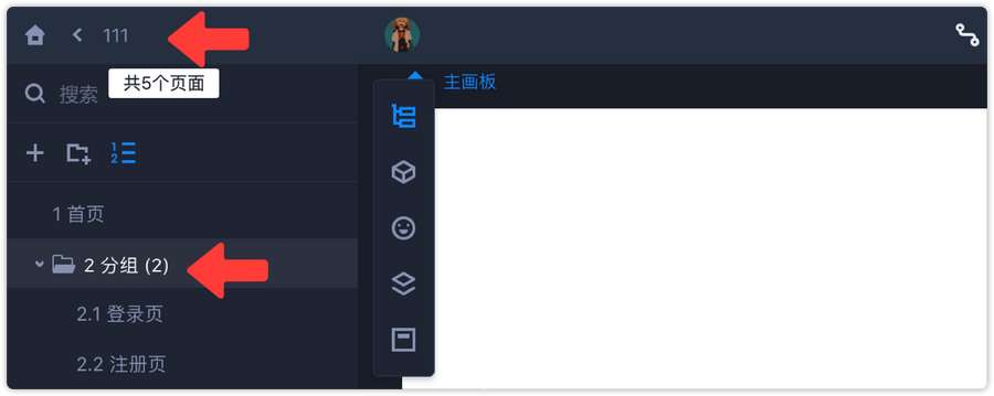 现在,鼠标hover在左上角项目名称上,会自动显示出当前项目内的页面总数。在项目树的分组名称后方,也会展示出该分组内的页面数量哦。